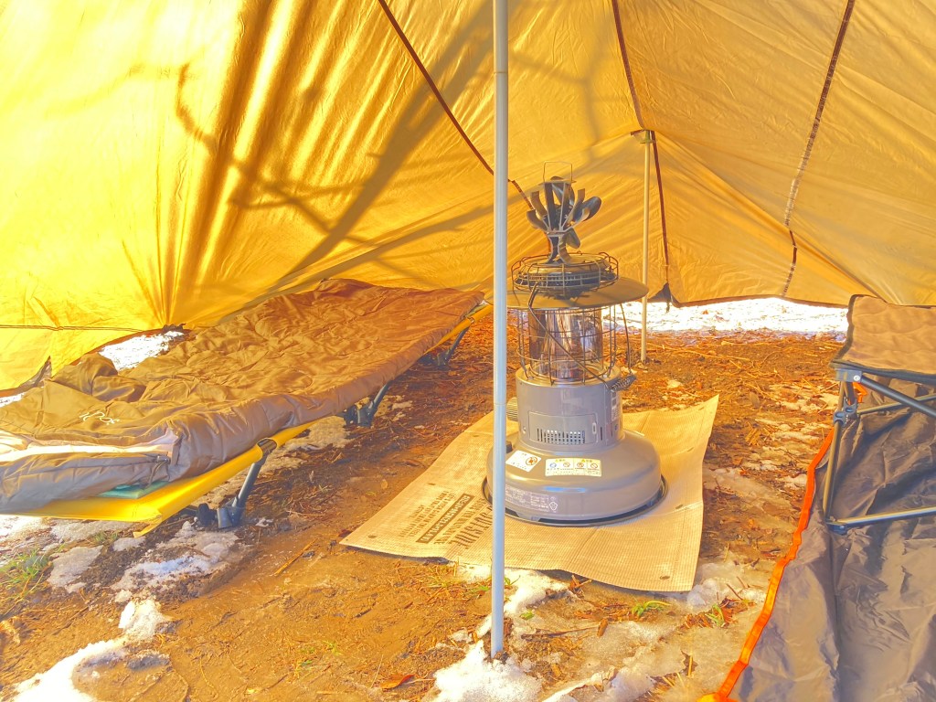 左に自分の寝床に真ん中にトヨトミのストーブを置いて右側にベルちゃんのお気に入りベッド😊❗️タープ内はシンプルにしてみました❗️